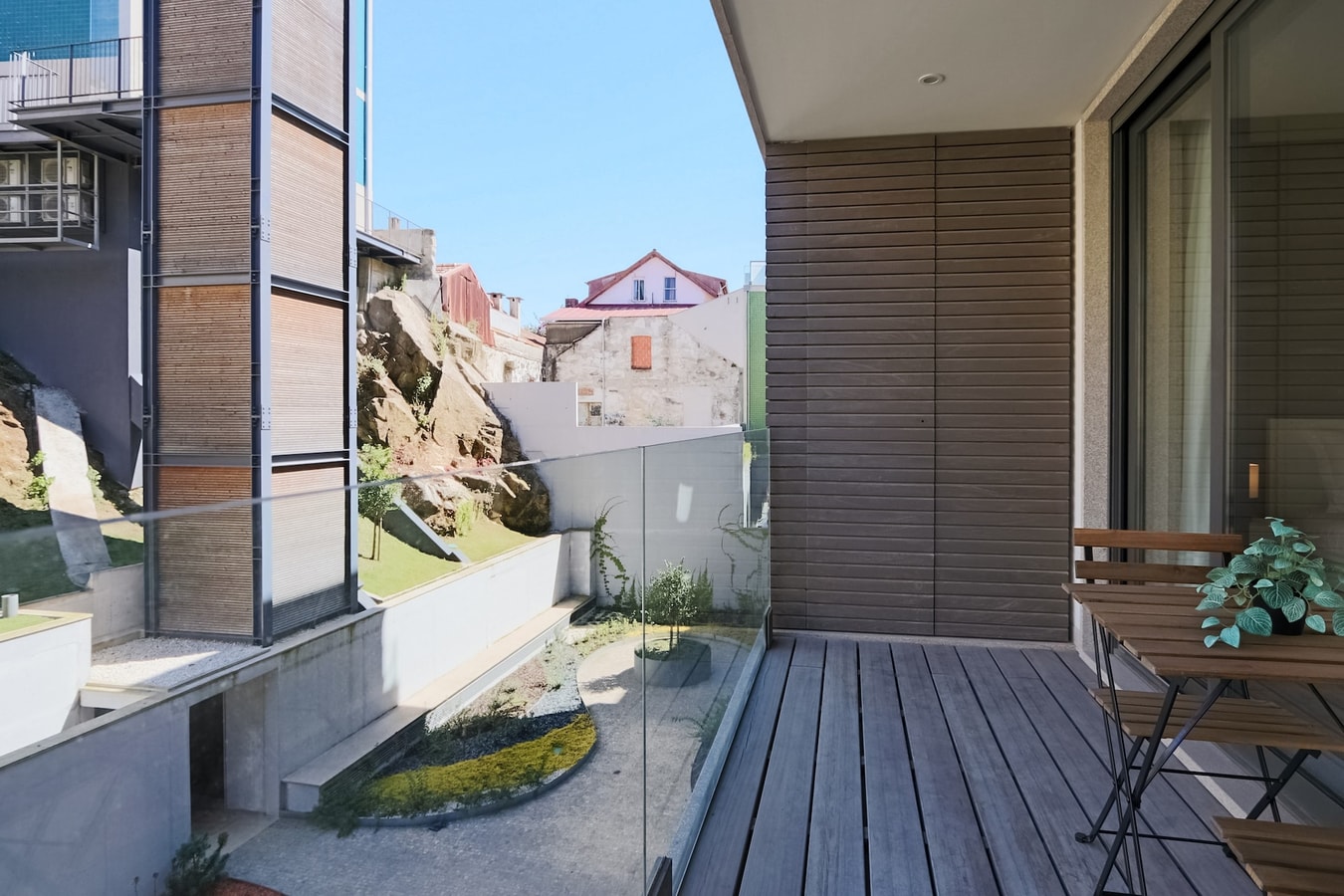 Para além das excelentes áreas comuns exteriores, pode contar com uma varanda privada com mobiliário exterior e chão em deck de madeira, onde poderá apreciar o pequeno-almoço e outras refeições, ou apenas relaxar após um dia de passeio pela cidade. Na varanda existe zona de lavandaria com máquina de lavar roupa, estendal, ferro e tábua de engomar. Não é permitido fumar no interior.