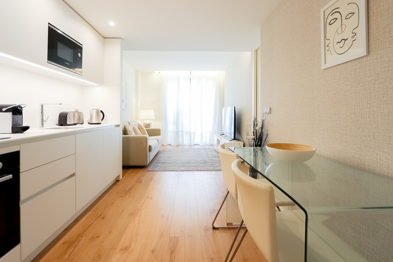 A sala de estar tem uma mesa de refeições, um sofá, móvel com TV, uma cozinha equipada com máquina de lavar a loiça, frigorífico com congelação, utensílios de cozinha e louça variada, forno, placa de indução, forno microondas, máquina de café, chaleira elétrica, torradeira, entre outros.